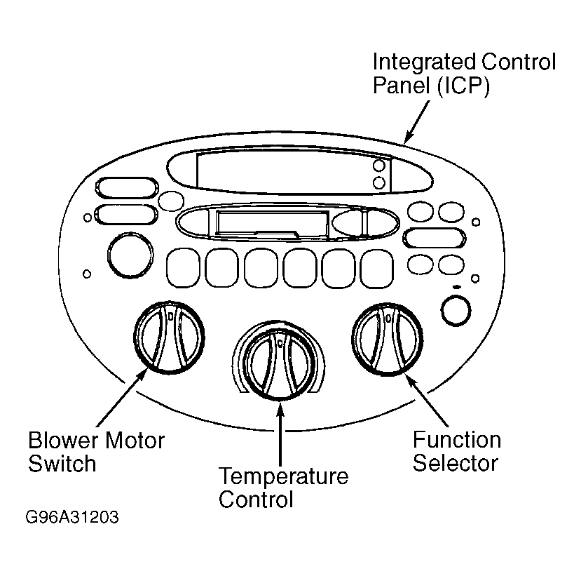 Function selector knob, located on integrated control panel, controls air distribution. See Figure . The function selector knob operates 2 electrical switches to supply battery voltage to A/C clutch circuit and blower motor circuit and a vacuum selector valve to control vacuum motors which position airflow control doors inside the heater assembly. The position of these doors determines to which outlets air will be delivered. Six positions are available: OFF, panel, panel/floor, floor, floor/defrost, and defrost.