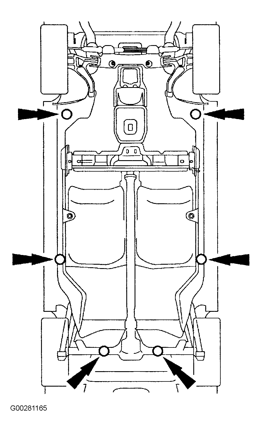 Do not allow the hoist adapters to contact the steering linkage, suspension arms, stabilizer bar, rear subframe stabilizer brackets or to compress the lower suspension arm stabilizer bar insulator. Damage to the suspension, exhaust and steering linkage components may occur if care is not exercised when positioning the hoist adapters of two-post hoists prior to lifting the vehicle. Never use the differential housing as a lift point. Damage to the differential housing and cover. To prevent possible damage to the underbody, do not drive the vehicle onto the drive-on hoist without first checking for possible interference.