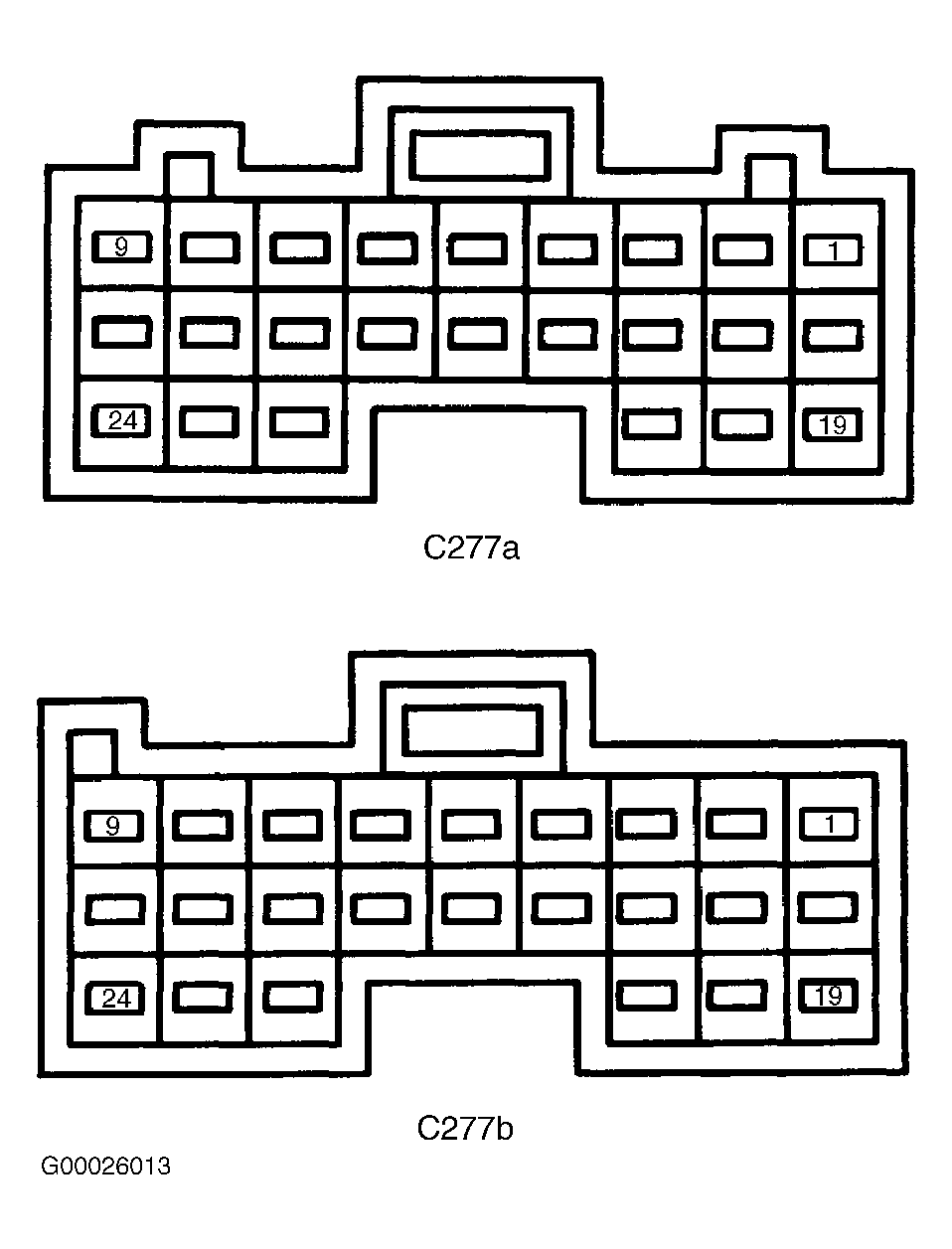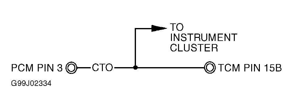Turn ignition off. Disconnect TCM and PCM harness connectors. Inspect connectors for damaged pins and repair if necessary. Using DVOM, measure resistance of CTO circuit (Green/White wire) between TCM harness connector C277b terminal No. 15 and PCM harness connector terminal No. 3, and chassis ground. See Figure, Figure and Figure . If resistance is less than 5 ohms between TCM and PCM, and more than 10 k/ohms between TCM and chassis ground, replace TCM. If resistance is 5 ohms or more between TCM and PCM, and 10 k/ohms or less between TCM and chassis ground, repair open or short to ground in CTO circuit. See WIRING DIAGRAMS article.