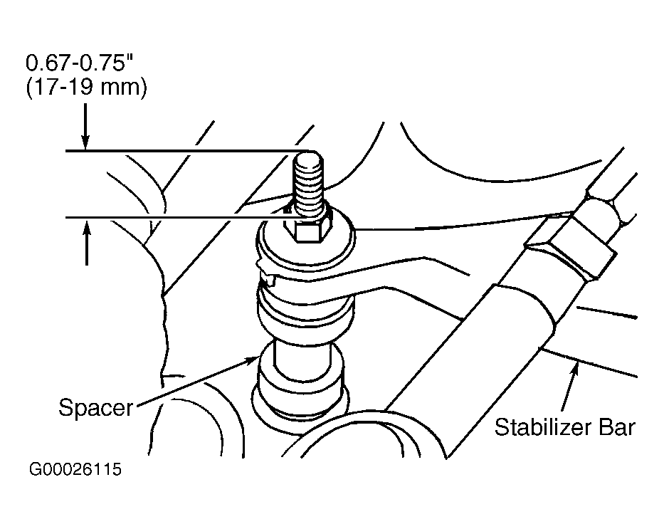 To install, reverse removal procedure. On Escort, DO NOT tighten pivot bolts until vehicle is lowered and at operating level. Tighten stabilizer bar link bushing nuts so that .67-.75" (17-19 mm) of thread is exposed. See Fig 3 . Install NEW nuts and bolts. On Escort, apply Threadlock 262 onto lower ball joint nut and pinch bolt threads. Tighten all fasteners to specification. See TORQUE SPECIFICATIONS  .