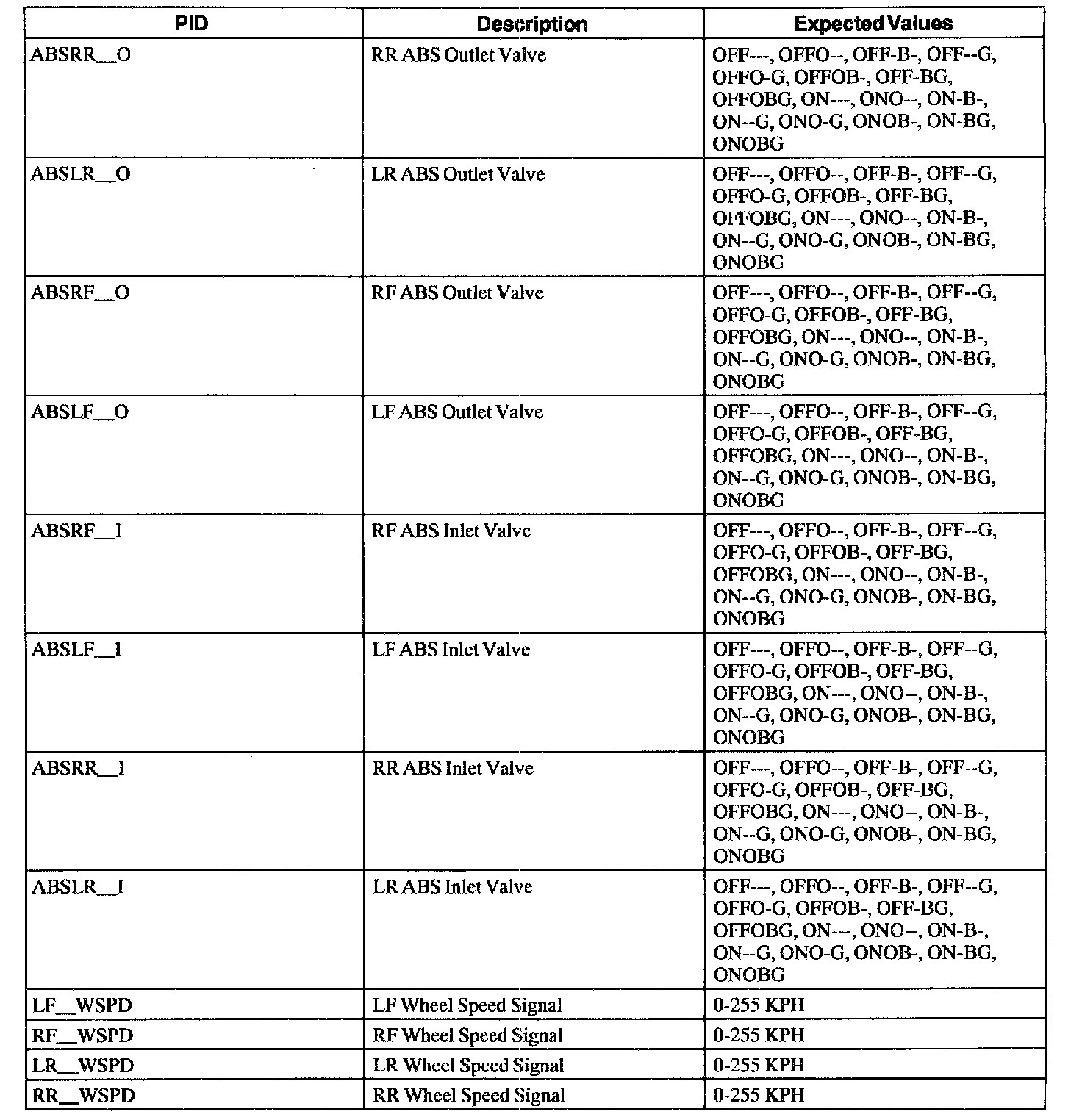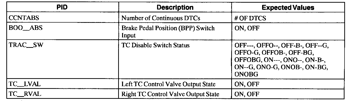 ABS Control Module Parameter Identification (PID) Index