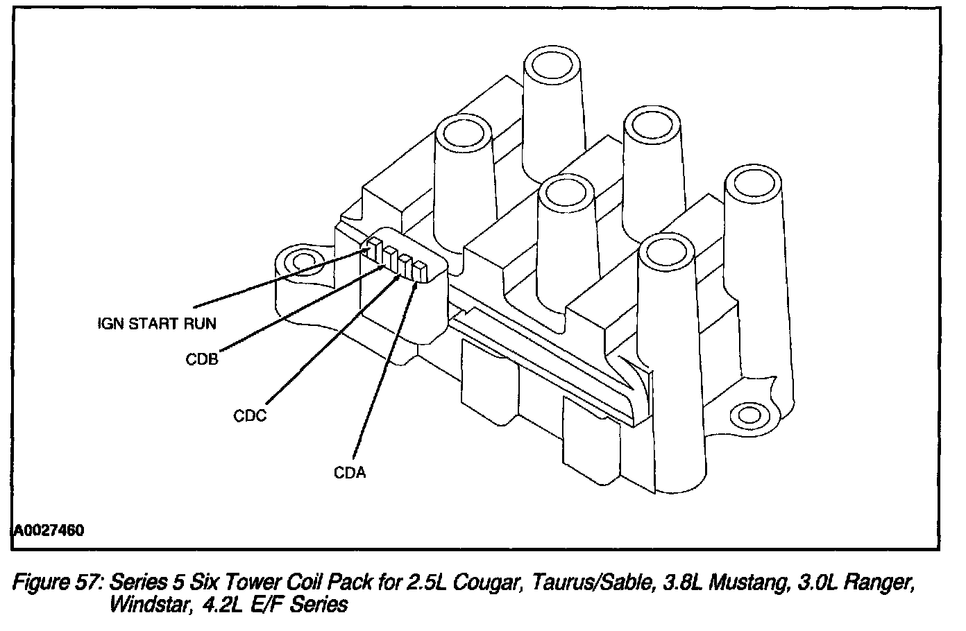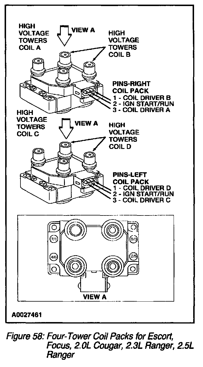 Coil packs come in four tower, Series 5 four tower, six-tower horizontal connector and Series 5 Six tower models. Two adjacent coil towers share a common coil and are called a matched pair. For six-tower coil pack (six cylinder) applications the matched pairs are 1 and 5, 2 and 6, and 3 and 4 (Figure 56) and (Figure 57). For four-tower coil pack (four cylinder) applications the matched pairs are 1 and 4, and 2 and 3 (Figure 58) and (Figure 59).