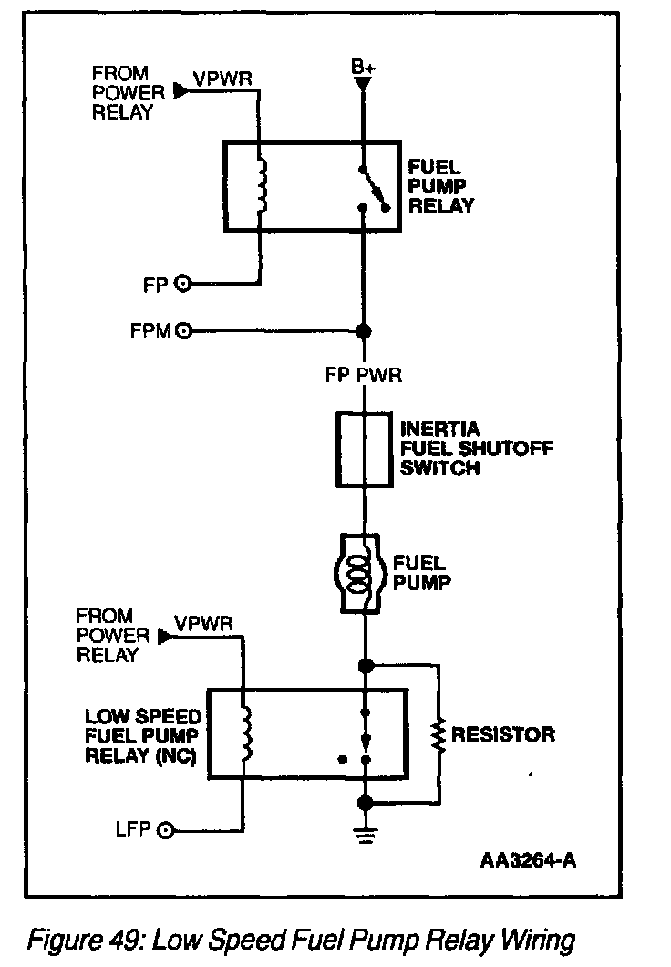 For applications with two speed fuel pumps, a normally closed low speed fuel pump relay (Figure 49) is wired into the fuel pump ground circuit With the low speed fuel pump relay contacts in the normally closed position, there is no extra resistance in the ground circuit for high speed operation. For low speed fuel pump operation, the PCM will ground the Low Fuel Pump (LFP) circuit, which opens the relay contacts. With the relay contacts open, the fuel pump ground circuit now passes through a resistor that is wired into the circuit.