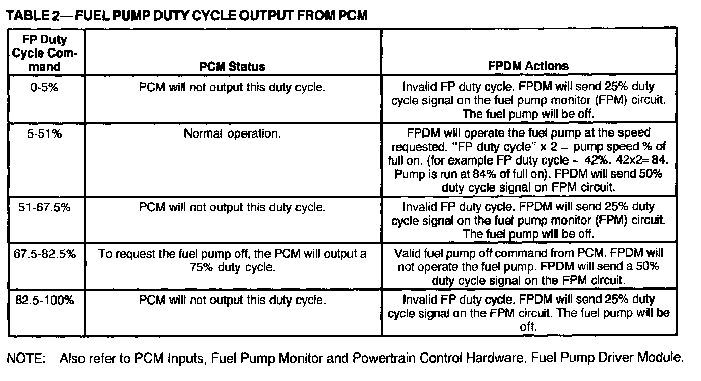 The Fuel Pump (FP) signal is a duty cycle command sent from the Powertrain Control Module (PCM) to the Fuel Pump Driver Module (FPDM) (Table 2). The FPDM uses the FP command to operate the fuel pump at the speed requested by the PCM or to turn the pump off.