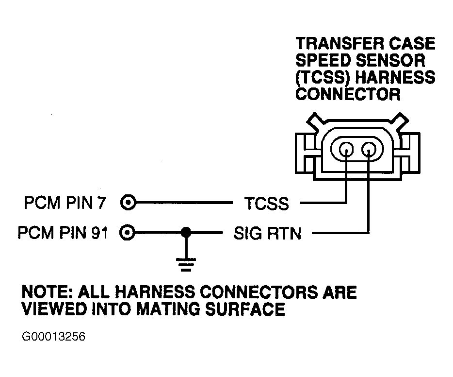 Transfer Case Speed Sensor (TCSS) provides rotational speed of transfer case output shaft. This signal is used on some models as source of vehicle speed information. Disconnect TCSS 2-pin connector, located on left rear of transmission. Inspect connector for loose, damaged or corroded terminals. Repair as necessary. If connector terminals are okay, go to next step. - 31) Check TCSS Resistance