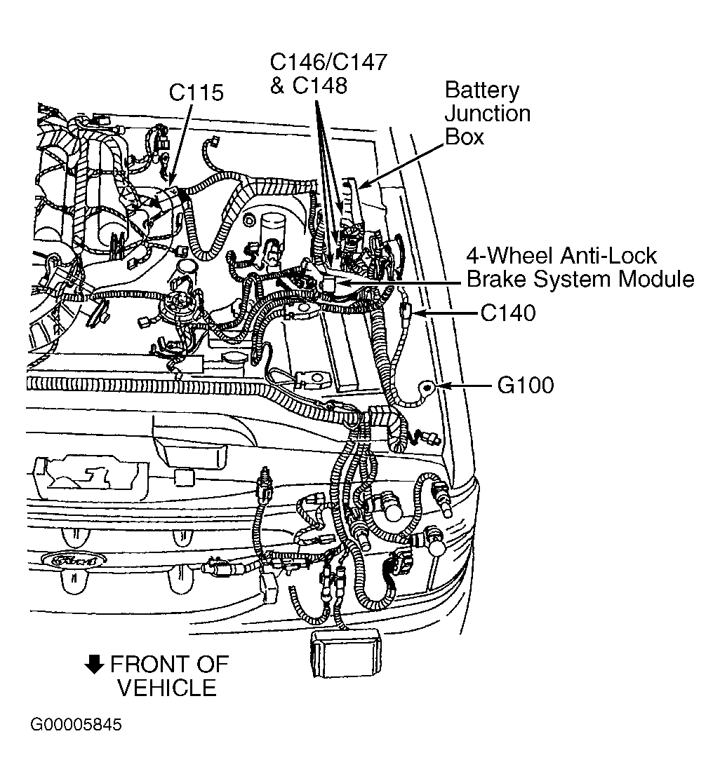 23. Turn ignition off. Disconnect in-line 12-pin connector C140 located near 4WABS module. Turn ignition on. Measure voltage between DLC terminals No. 7 (Light Blue/White wire) and No. 16 (Orange wire). Measure voltage between DLC terminals No. 7 (Light Blue/White wire) and No. 4 (Black wire). If either reading indicates no voltage, repair Light Blue/White wire between male half of in-line connector C148 and male half of in-line connector C140. Retest system for normal operation. If both readings indicate voltage, repair Light Blue/White wire between female half of in-line connector C140 and 4WABS module. Retest system for normal operation.