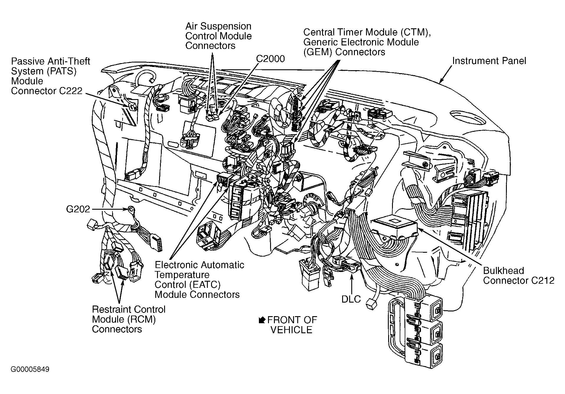 9. Turn ignition off. Reconnect ARC module connector C2000. Disconnect GEM/CTM 26-pin connector C280. Turn ignition on. Measure voltage between DLC terminals No. 7 (Light Blue/White wire) and No. 16 (Orange wire). See Figure. Measure voltage between DLC terminals No. 7 (Light Blue/White wire) and No. 4 (Black wire). If either reading indicates no voltage, go to next step. If both readings indicate voltage, replace GEM/CTM and retest system for normal operation.