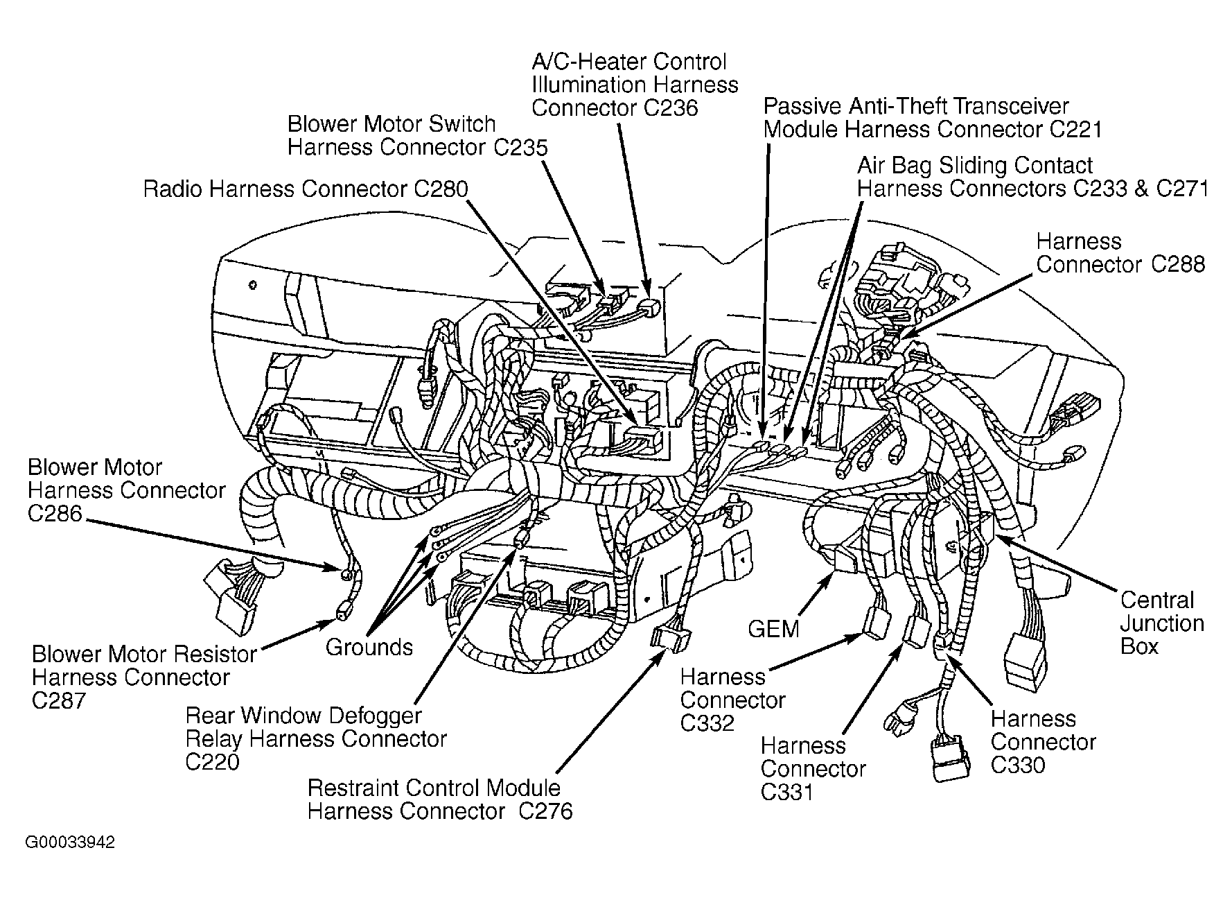 - Turn ignition switch to LOCK position. Measure resistance between ground and GEM harness connector C291 terminal No. 2 (Black/White wire). If resistance is 5 ohms or less, repair module communication concern. See MODULE COMMUNICATIONS NETWORK - MUSTANG article. If resistance is more than 5 ohms, repair open in Black/White wire between GEM and ground. Ground point is located behind center of instrument panel. See GROUND DISTRIBUTION article in WIRING DIAGRAMS.