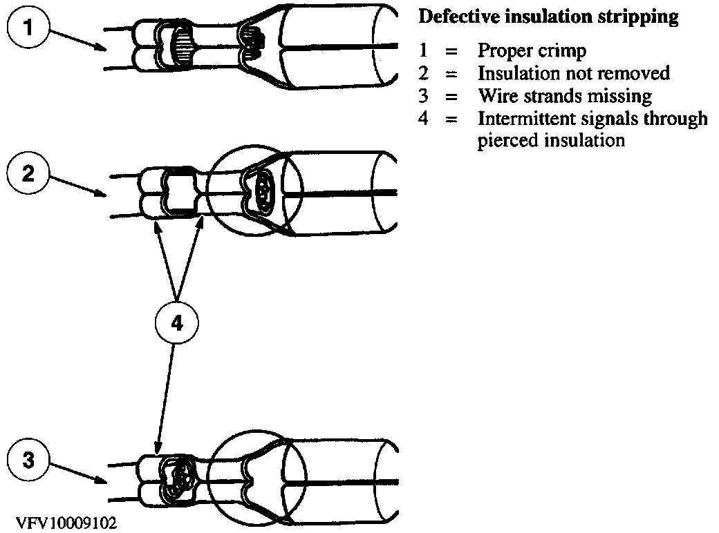 These illustrations are known examples of wiring harness, splices and connectors that will create intermittent electrical concerns. The concerns are hidden and can only be discovered by a physical evaluation as shown in each illustration.