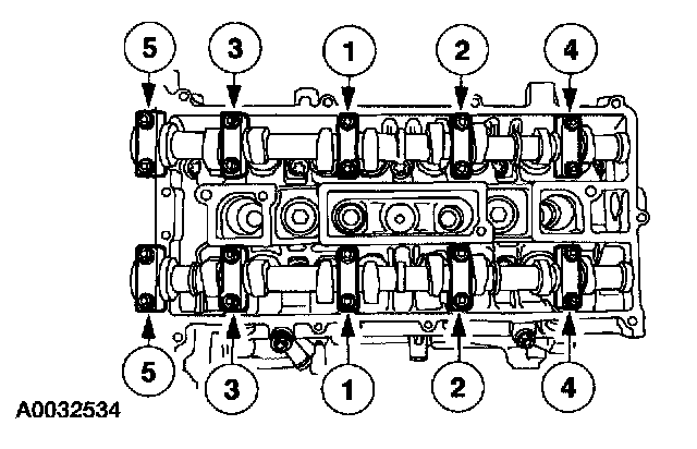 Install the camshafts and bearing caps. Tighten the bolts in the sequence shown in three stages.