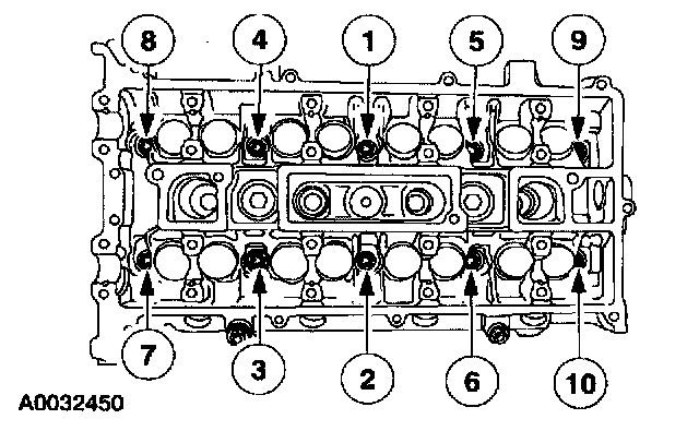 Cylinder HeadInstall the cylinder head and lubricate the cylinder head bolts with clean engine oil. Install the cylinder head bolts and tighten the bolts in the sequence shown in five stages.