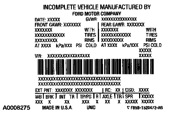 The upper portion of the Vehicle Certification (VC) label contains the manufacturer name, the month and year of manufacture, the certification statement, and the VIN. It also includes gross Vehicle Weight Ratings (GVWR).