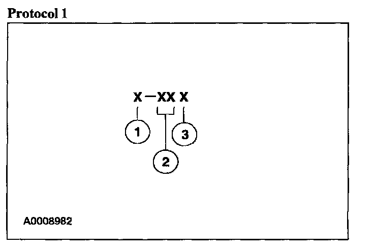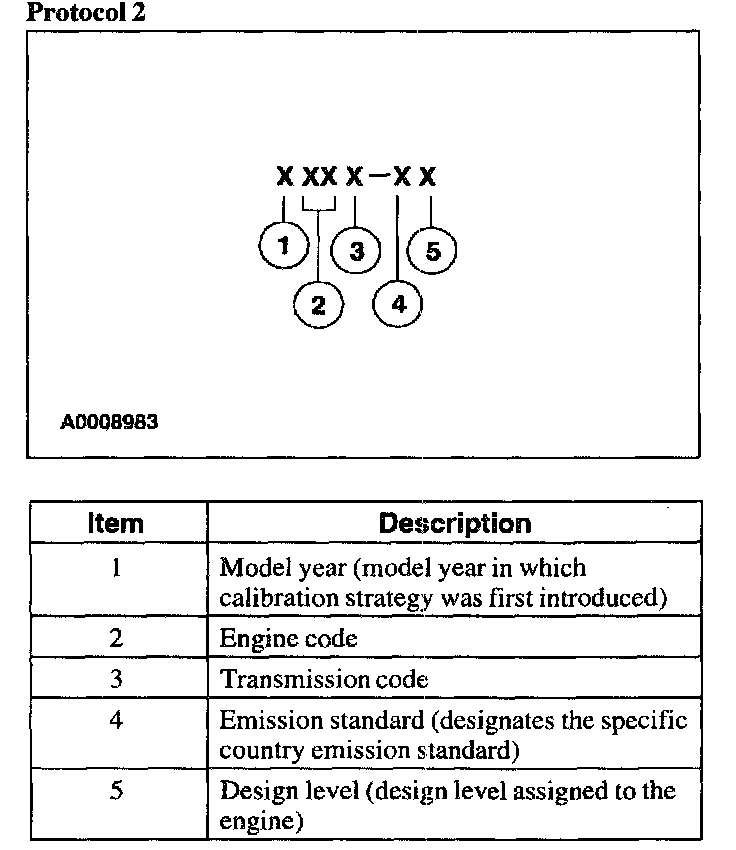 Powertrain calibration information is printed in the lower right corner of the vehicle certification label. Only the base calibration information is printed. Revision levels will not appear, however, this information can be found in On Line Automotive Service Information System (OASIS). For the current model year, Ford Motor Company is using three different protocols which describe powertrain base calibration. These protocols are designed to provide worldwide standardization for vehicle calibration. If the electronic calibration strategy has been used since 1998 and carried into the current model year, Protocol 1 will be used. Refer to Protocol 1 below. If the electronic calibration strategy has been used since 1999 and is carried into the current model year, Protocol 2 will be used. Refer to Protocol 2 below. Electronic calibration strategies introduced in the 2000 or 2001 model year will use Protocol 3. Refer to Protocol 3 below.