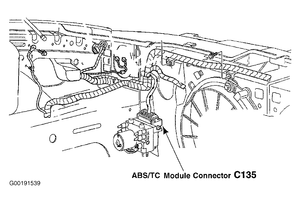 - Turn ignition switch to LOCK position. Disconnect ABS module harness connector C135, located in left front of engine compartment. See Figure. Turn ignition switch to RUN position. Measure voltage between DLC terminals No. 2 (Tan/Orange wire) and No. 4 (Black wire), No. 2 (Tan/Orange wire) and No. 16 (Light Blue/White wire), No. 4 (Black wire) and No. 10 (Pink/Light Blue wire), and No. 10 (Pink/Light Blue wire) and No. 16 (Light Blue/White wire). See Figure. SeeWIRING DIAGRAMS . If voltage is not present at all measurements, go to next step. If voltage is present at any measurement, replace ABS module. See ANTI-LOCK BRAKE CONTROL MODULE under REMOVAL & INSTALLATION. After repair, test system for normal operation.
