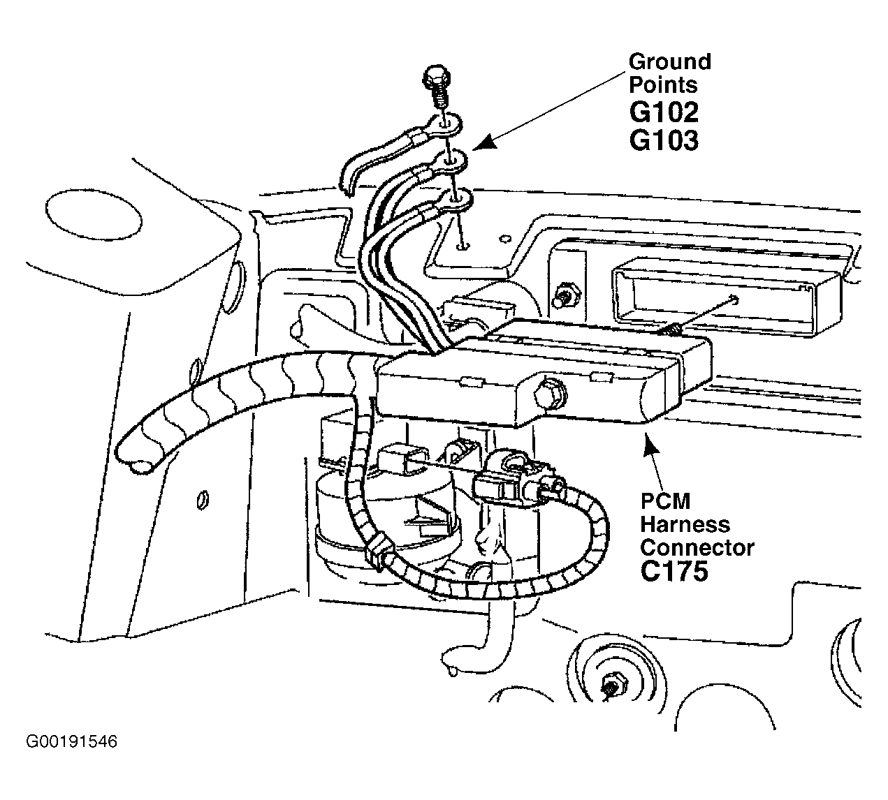 - Inspect Data Link Connector (DLC) terminals. See Figure. If problem exists, repair as necessary. Turn ignition switch to LOCK position. Disconnect Powertrain Control Module (PCM) 104-pin harness connector C175, located on right side of firewall in engine compartment. See Figure. Measure resistance between DLC terminal No. 2 and PCM harness connector C175 terminal No. 16 (Tan/Orange wire). Also measure resistance between DLC terminal No. 10 and PCM harness connector C175 terminal No. 15 (Pink/Light Blue wire). See Figure and Figure . SeeWIRING DIAGRAMS . If both resistances are 5 ohms or less and vehicle is equipped with Anti-Lock Brake System (ABS) module or Remote Climate Control (RCC) module, go to next step. If both resistances are 5 ohms or less and vehicle is not equipped with ABS module or RCC module, See TEST E: POWERTRAIN CONTROL MODULE DOES NOT RESPOND TO WDS OR NGS TESTER . If either resistance is greater than 5 ohms and vehicle is equipped with ABS module or RCC module, repair open circuit in appropriate wire. If either resistance is greater than 5 ohms and vehicle is not equipped with ABS module or RCC module, See TEST E: POWERTRAIN CONTROL MODULE DOES NOT RESPOND TO WDS OR NGS TESTER . After repair, test system for normal operation.