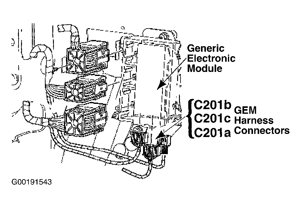 - Disconnect Generic Electronic Module (GEM) 20-pin harness connector C201b, located attached to under side of Central Junction Box (CJB). See Figure. Inspect GEM 20-pin harness connector C201b for damage, bent terminals or corrosion. If problem exists, repair as necessary. Measure resistance between DLC terminal No. 7 and GEM harness connector C201b terminal No. 3 (Light Blue/White wire). See Figure and Figure . SeeWIRING DIAGRAMS . If resistance is 5 ohms or less, go to next step. If resistance is greater than 5 ohms, repair open circuit in Light Blue/White wire between GEM and DLC.