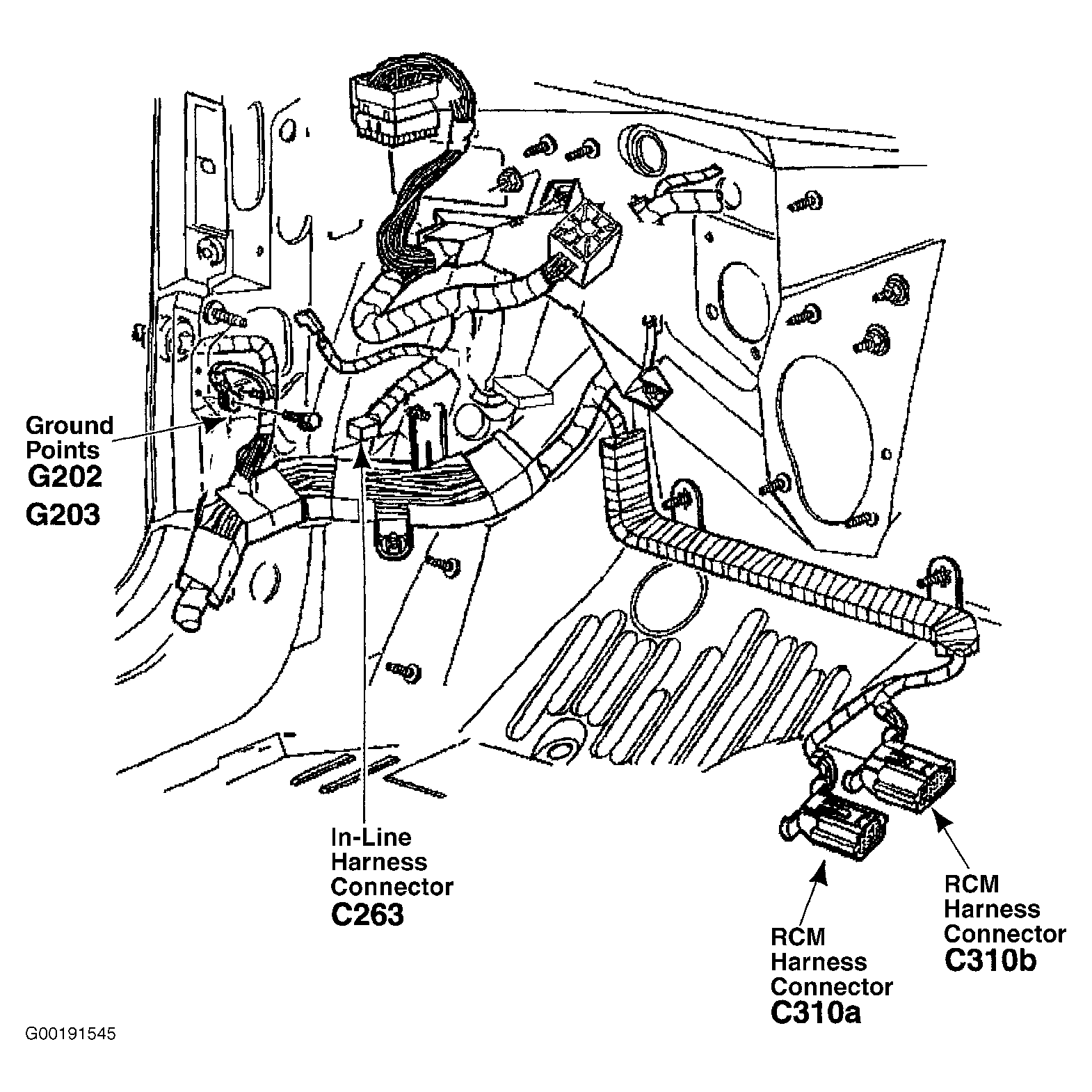 - Turn ignition switch to LOCK position. Disable air bag system. See DISABLING & ACTIVATING AIR BAG SYSTEM in appropriate AIR BAG RESTRAINT SYSTEMS article in RESTRAINTS. Disconnect Restraint Control Module (RCM) 24-pin harness connector C310a, located behind center of instrument panel, on tunnel. See Figure. Reconnect GEM harness connector C201b. Turn ignition switch to RUN position. Measure voltage between DLC terminals No. 4 (Black wire) and No. 7 (Light Blue/White wire), and No. 7 (Light Blue/White wire) and No. 16 (Light Green/Red wire). SeeWIRING DIAGRAMS . If voltage is not present at all measurements, go to next step. If voltage is present at any measurement, replace RCM. See RESTRAINT CONTROL MODULE under REMOVAL & INSTALLATION. After repair, test system for normal operation.