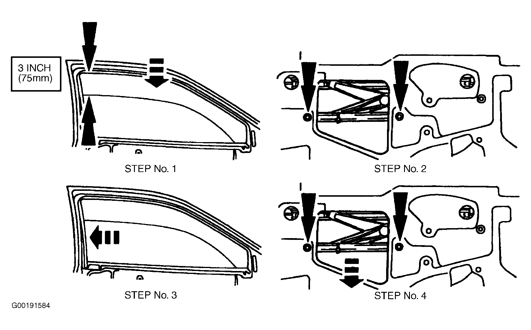 Remove door trim panel and watershield. See DOOR TRIM PANEL under REMOVAL & INSTALLATION. Lower door window 3" (76.2 mm) from full up position. See STEP 1 in Fig 1. Loosen bracket nuts securing window regulator equalizer bracket. See STEP 2 in Fig 1. With front door open, place hands on each side of front door window glass and pull front door window glass fully into front door window glass top run. See STEP 3 in Fig 1. Push door window regulator equalizer bracket down. Tighten bracket nuts to 106 INCH lbs. (12 N.m). See STEP 4 in Fig 1. Open and close window to verify proper operation and alignment. Install watershield and door trim panel.