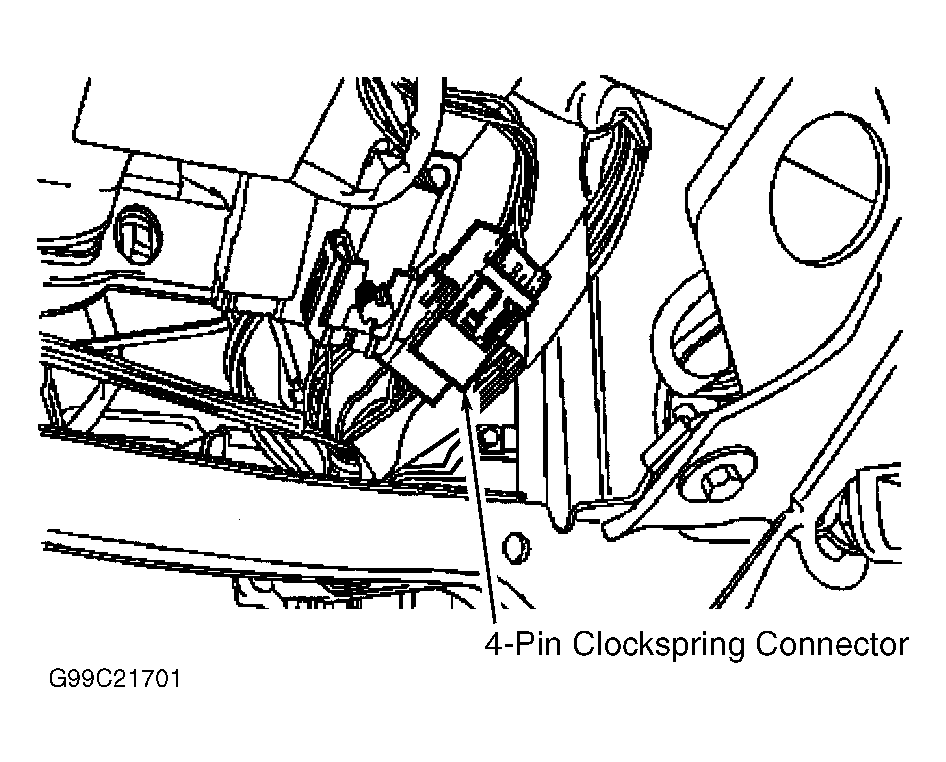 - Remove lower steering column opening cover bolts. Pull out on lower steering column opening cover to release clips and remove lower steering column opening cover with reinforcement. Push in on retaining tab and disconnect clockspring electrical connector, located at base of steering column. See Fig 1 . Install Air Bag Simulator (418-F403) to harness side of clockspring electrical connector. See AIR BAG SIMULATOR .