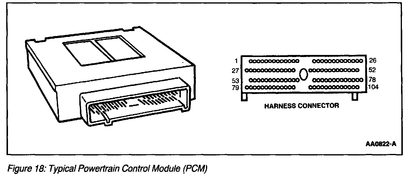 The center of the Electronic EC system is a microprocessor called the Powertrain Control Module (PCM). LS6/LS8 and 2002 Explorer/Mountaineer applications use a 150-pin PCM (Figure 19). This PCM will have three separate electrical harness connectors. All other applications will continue to use the standard 104-pin PCM (Figure 18). The PCM receives input from sensors and other electronic components (switches, relays). Based on information received and programmed into its memory, the PCM generates output signals to control various relays, solenoids and actuators.