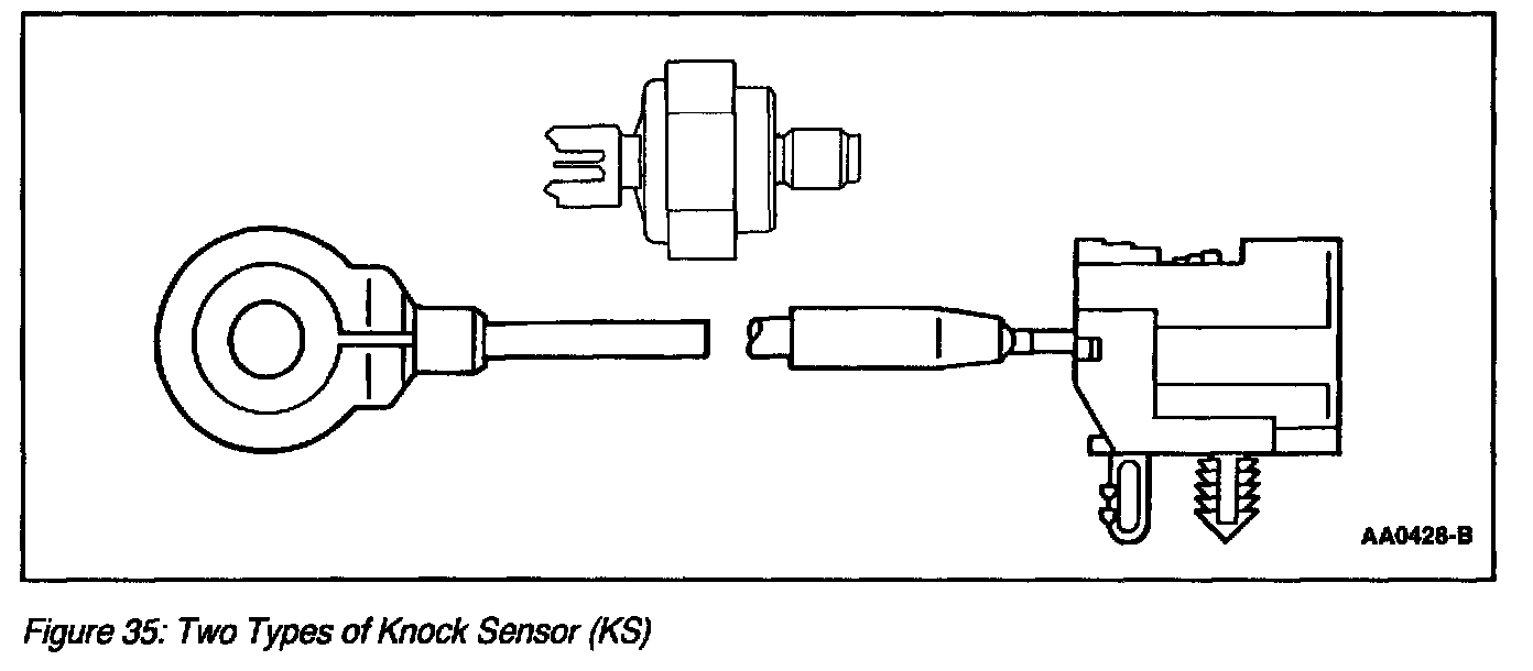 The Knock Sensor (KS) (Figure 35) is a tuned accelerometer on the engine which converts engine vibration to an electrical signal. The PCM uses this signal to determine the presence of engine knock and to retard spark timing.