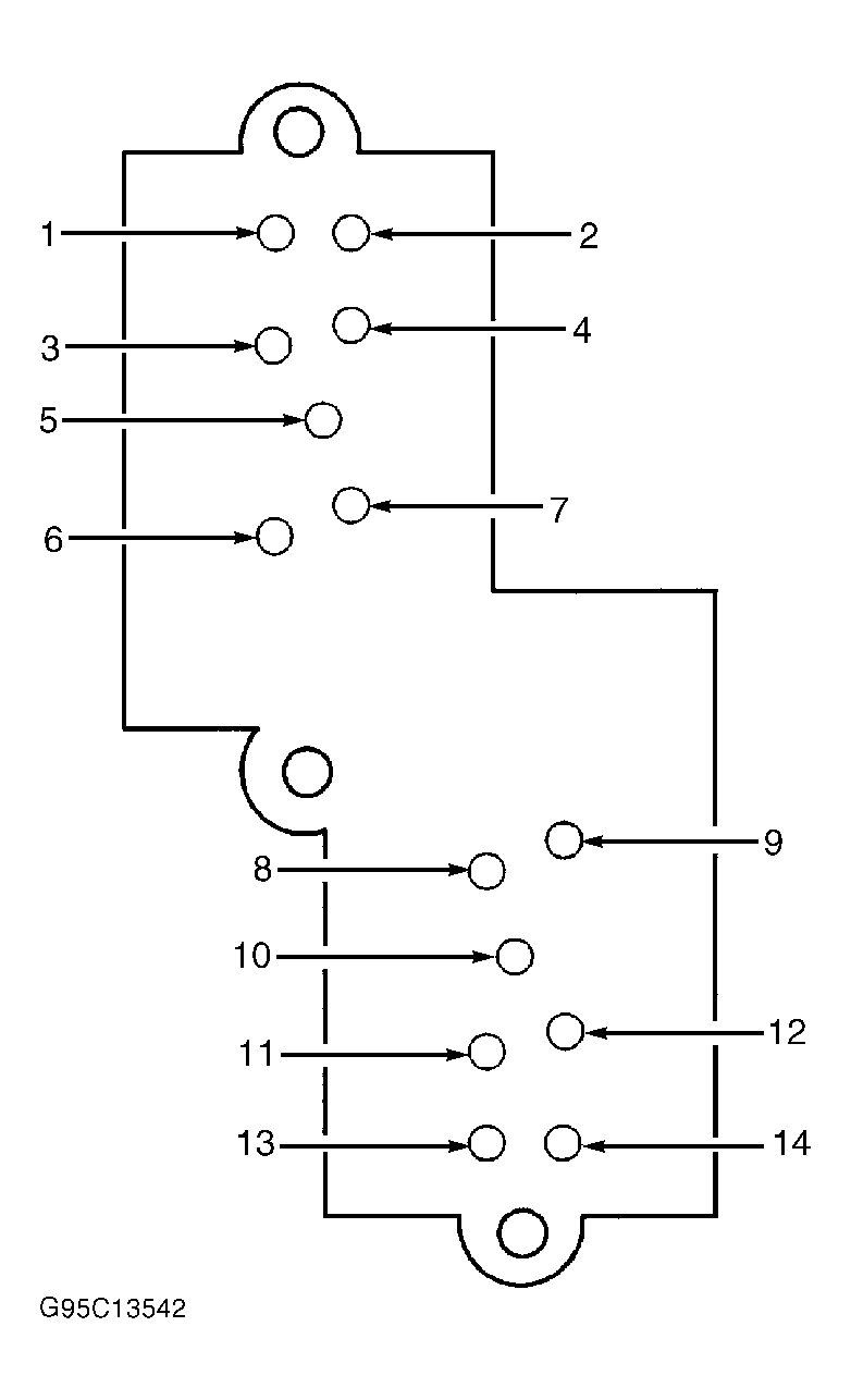- Turn ignition switch to LOCK position. Ensure passenger window switch lockout is OFF. Remove right front door trim panel. See DOOR TRIM PANEL under REMOVAL & INSTALLATION in POWER DOOR LOCKS & TRUNK RELEASE article. Disconnect right front power window/door lock switch 14-pin harness connector C629, located behind door trim panel. See Figure. Turn ignition switch to RUN position. Measure voltage between ground and right front power window/door lock switch harness connector C629 terminal No. 10 (Red/Light Blue wire). See Fig 1. See WIRING DIAGRAMS . If voltage is greater than 10 volts, replace right front window/door lock switch. See POWER WINDOW SWITCH under REMOVAL & INSTALLATION. If voltage is 10 volts or less, repair open circuit in Red/Light Blue wire between master power window switch and right front power window/door lock switch. After repair, test system for normal operation.