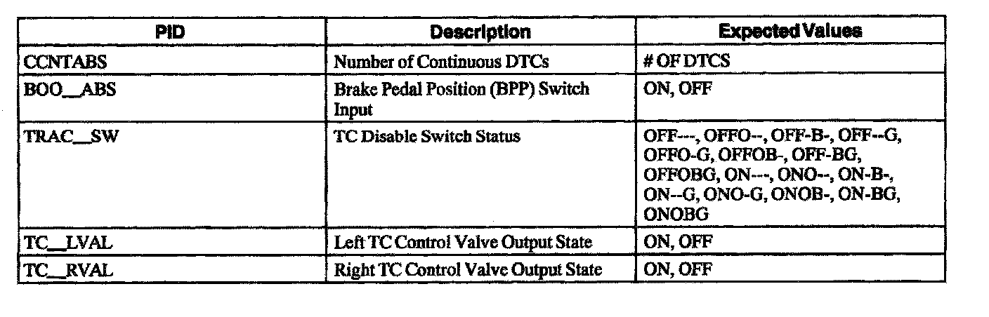 Anti-Lock Brake (ABS) Control Module Parameter Identification (PID) Index