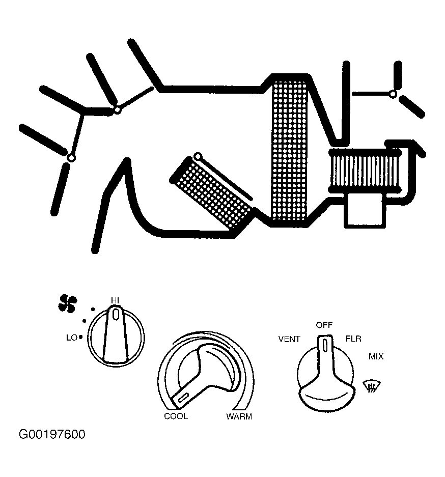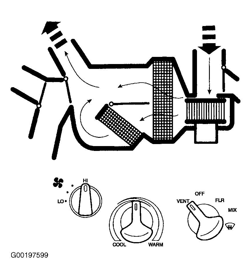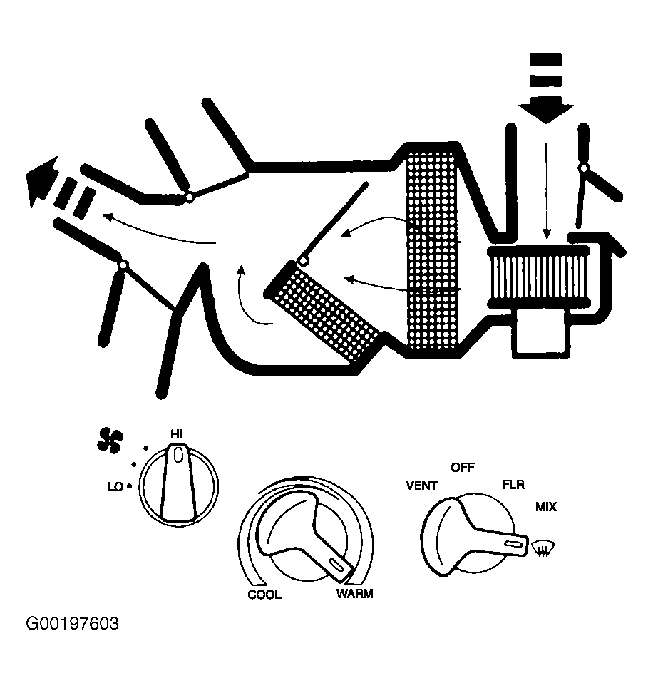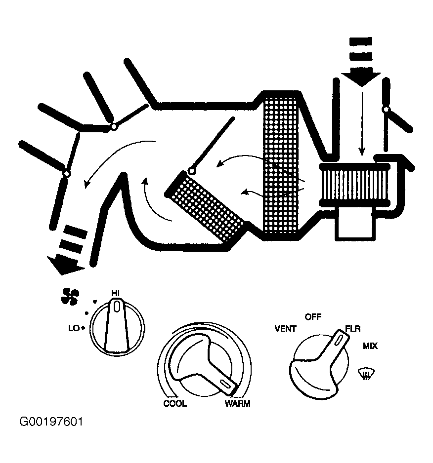 The function selector switch can be placed in OFF, vent, floor, mix and defrost positions. Position of function selector switch determines whether function doors are open, partially open or closed. Function doors direct air flow to selected outlets. 3 vacuum motors and doors are outside/recirculated air, defrost/panel and defrost/floor. See VACUUM DIAGRAMS .