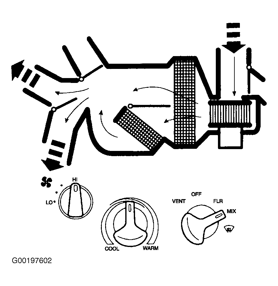 When MIX is selected, recirculation air duct door is in no vacuum position blocking recirculated air and admitting outside air. See Fig 4. Floor/panel door is in no vacuum position, blocking air circulation to instrument panel registers. Floor/defrost door is in partial vacuum position, allowing air flow to both windshield defroster hose nozzle and heater outlet floor duct. There is also some air flow to side window demisters. Blower motor is on.