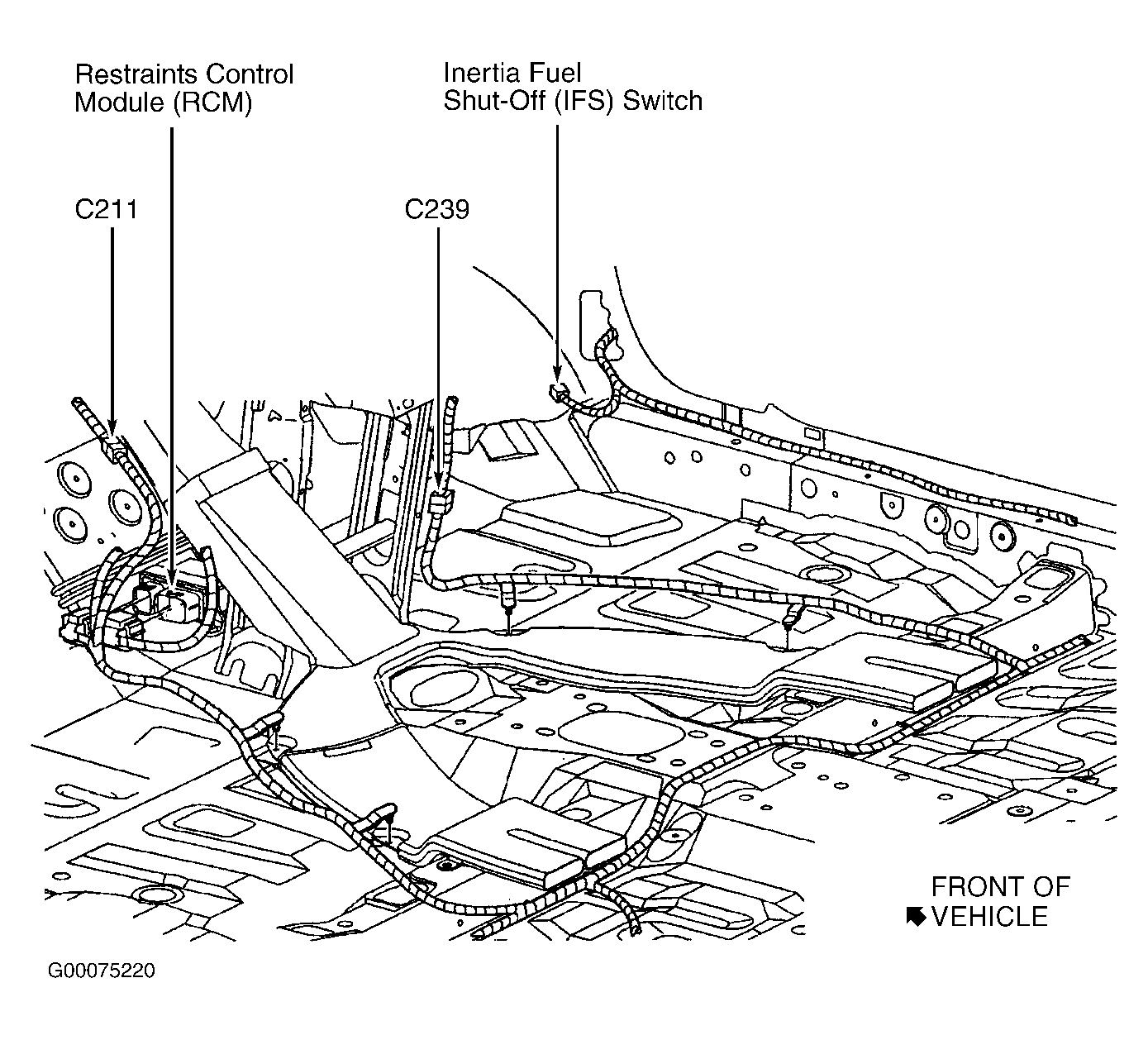 Restraints Control Module (RCM) Beneath lower center of dash, on transmission tunnel. See Figure .