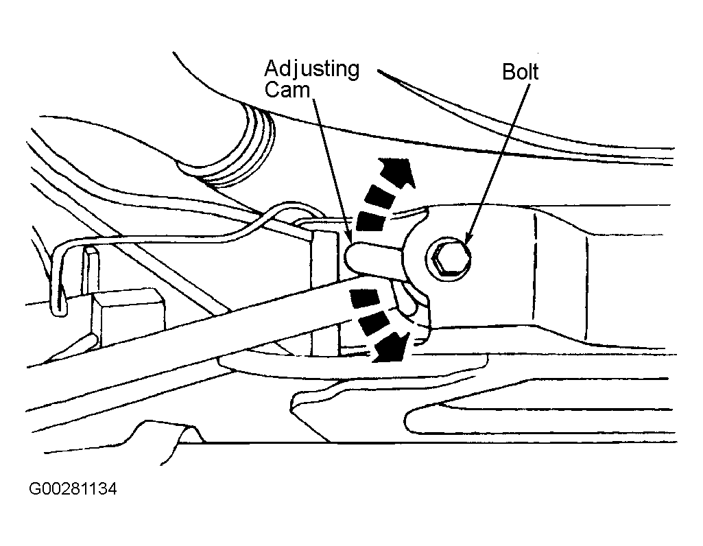 Loosen both lower control arm and bushing bolts. See Fig 1 . Turn left and right side adjusting cams simultaneously until toe in within specification. See WHEEL ALIGNMENT SPECIFICATIONS  . Tighten bolts to specification. See TORQUE SPECIFICATIONS  .