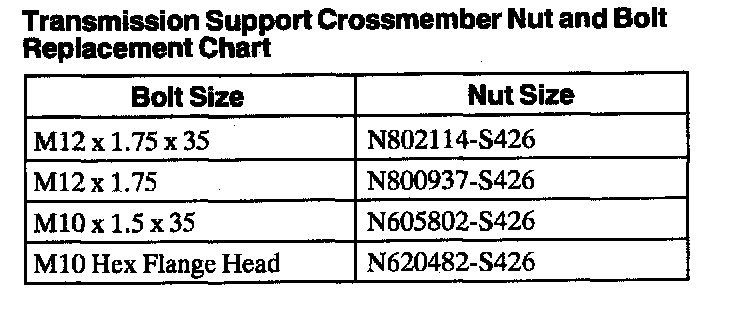 Transmission Support Crossmember Nut And Bolt Replacement Chart: