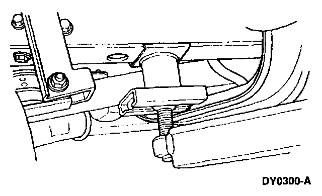 ^ When raising a vehicle on a twin-post hoist, use care when positioning the vehicle so that the hoisting forks do not interfere with the shock absorber mounting brackets or stabilizer mounting brackets, if so equipped, or damage the axle carrier or rear cover.