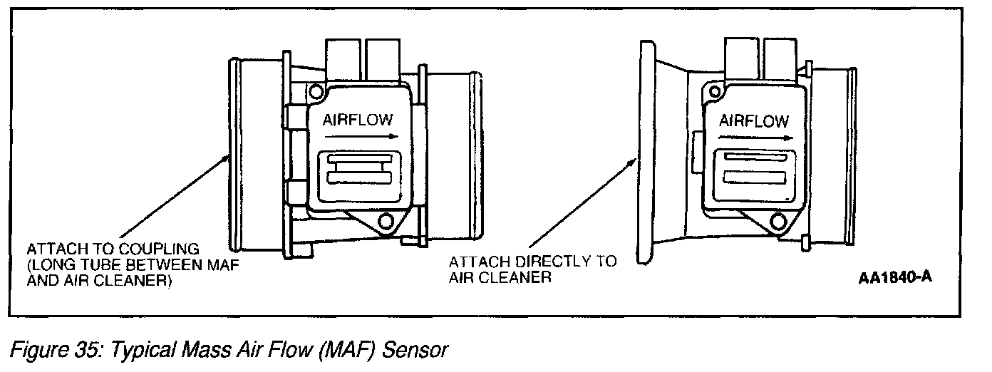 The Mass Air Flow (MAF) sensor uses a hot wire sensing element to measure the amount of air entering the engine. Air passing over the hot wire causes it to cool. This hot wire is maintained at 200°C (392°F) above ambient temperature as measured by a constant cold wire (Figure 35). If the hot wire electronic sensing element must be replaced, then the entire assembly must be replaced. Replacing only the element may change the air flow calibration.