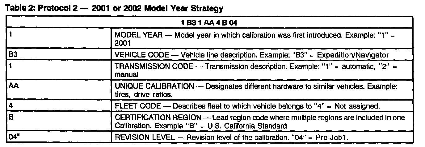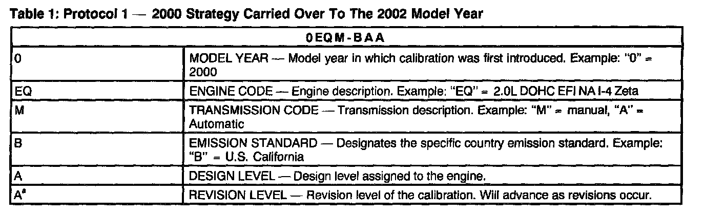 Powertrain Base Calibration Information is located in the lower right corner of the Vehicle Certification Label. Only the Base Calibration will appear on this label (Figure 2). The Revision Level is no longer printed on the label; however, it can be found in On-Line Automotive Service Information System (OASIS). For the current model year Ford Motor Company is using two different Protocols which describe Powertrain Base Calibration. The Protocols are designed to provide worldwide standardization for vehicle calibration. If Electronic Engine Control (EC)'s strategy is two years old and carried over to the current model year, Protocol 1 is used (see table 1). One year old and new strategies for the current model year use Protocol 2 (see table 2). For more information on Vehicle Certification Label or Powertrain Calibration, refer to the appropriate Vehicle Systems.