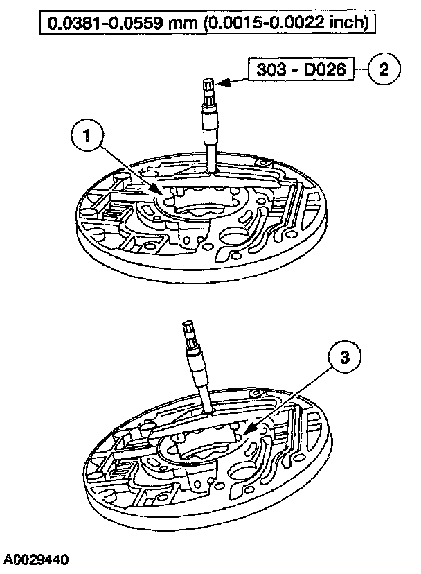 2 Using the special tool, measure and record the depth of the inner gerotor gear face to the pump body machined surface. Repeat measurement for a total of three readings in equally spaced locations on the gear face. If the reading is not within specification, replace the front pump assembly.