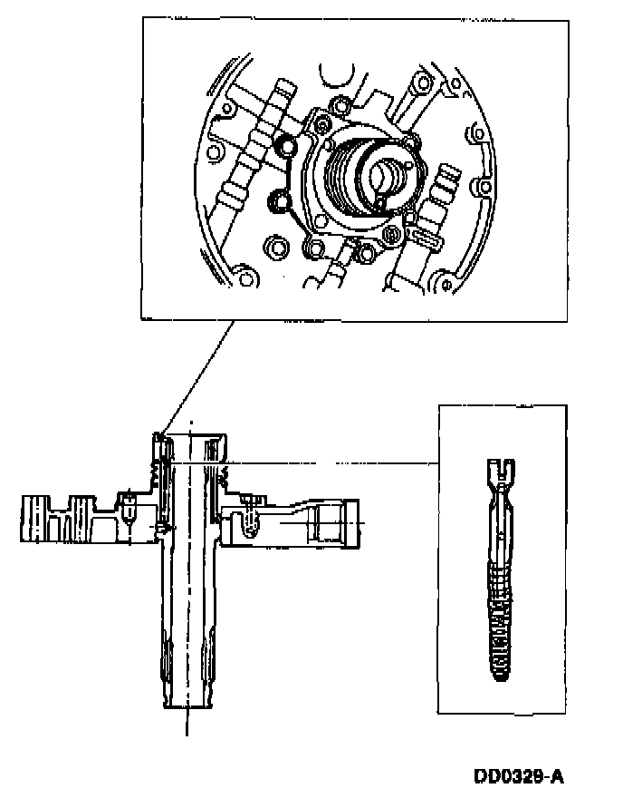 3 Install the converter regulator valve assembly. Then apply pressure to the end plug and install the retainer, making sure it is correctly scaled.