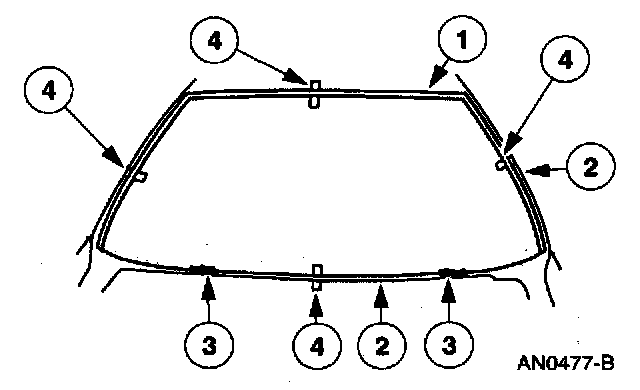 9. Making the application approximately 25 mm (1 in) wide, apply two coats of Essex 401 Urethane Glass Primer, Ford specification WSB-M5B280-C2 (red), to the entire inside perimeter of the windshield glass.
