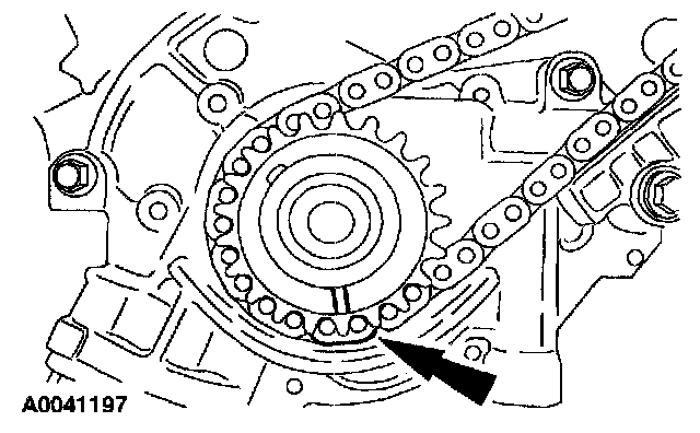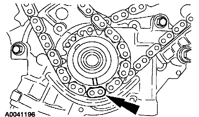 Position the lower end of the LH (inner) timing chain on the crankshaft sprocket, aligning the timing mark on the outer flange of the crankshaft sprocket with the single copper (marked) link on the chain.