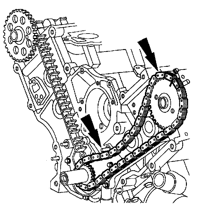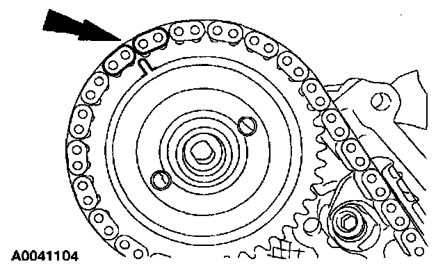 Position the timing chain on the camshaft sprocket with the camshaft sprocket timing mark positioned between the two copper (marked) chain links.