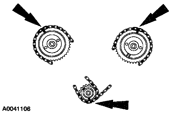 Position the RH timing chain on the camshaft sprocket. Make sure the camshaft sprocket timing mark is positioned between the two copper (marked) chain links.