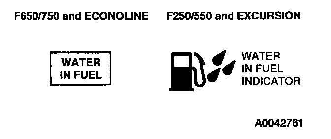 The Water in Fuel Indicator is controlled by the instrument cluster. The cluster receives electronic information, via Standard Corporate Protocol (SCP) communications, from the PCM for water in fuel status. If the water in fuel sensor indicates that there is water in the fuel separator/housing, the PCM sends an SCP message to the cluster to illuminate the water in fuel indicator.