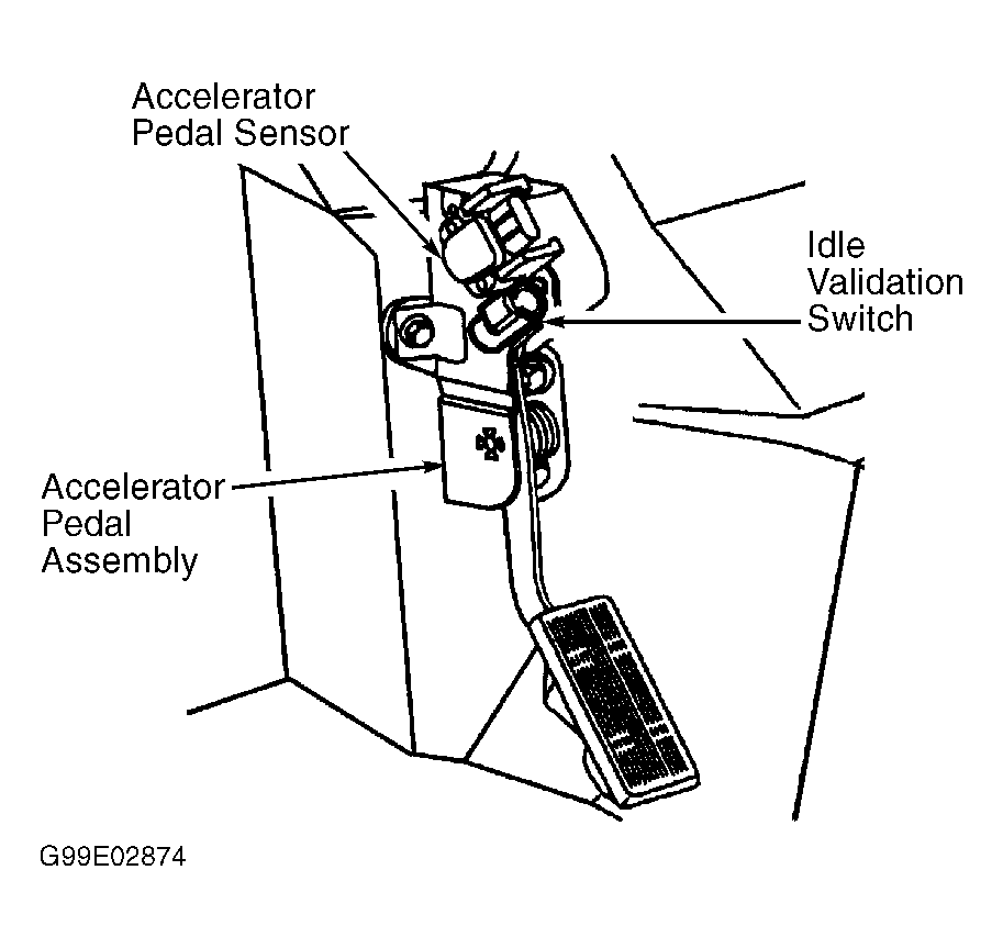The PCM uses Idle Validation Switch (IVS) signal to verify when accelerator pedal and shaft is in idle position. Any detected malfunction of IVS will illuminate MIL and engine will operate at low idle only. IVS is not serviced separately. IVS is part of accelerator pedal assembly. See Figure. If IVS is defective, accelerator pedal assembly must be replaced.