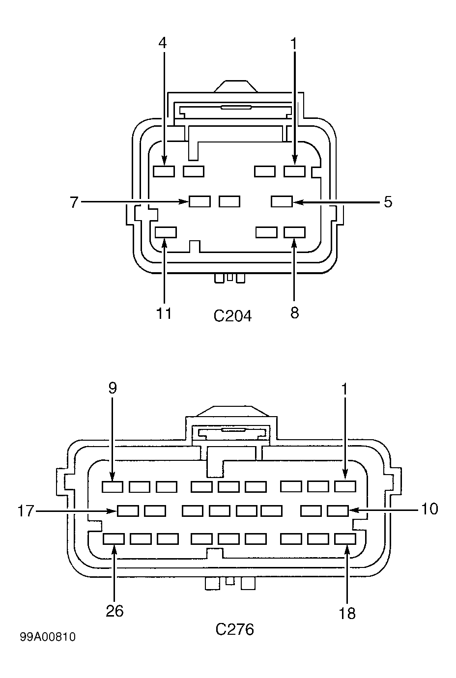 Turn ignition switch to OFF position. Measure resistance between harness side of RCM connector C310A, terminal No. 1 and OCS connector C3159A, terminal No. 5. (Dark Green/Violet wire). See Figure & Fig 1 . If resistance is less than 0.24 ohm, go to next step. If resistance is more than 0.24 ohm, repair open in Dark Green/Violet wire. Go to step 12 . - Check for open circuit between OCS & RCM
