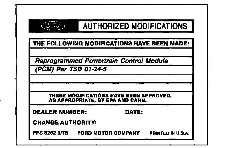 Obtain an Authorized Modifications Decal (FPS 8262 - obtainable through DOES II, 25/pkg) and list the date, dealer number, and summary of modifications performed. Select a prominent place adjacent to the Vehicle Emission Control Information Decal suitable for installing the Authorized Modifications Decal. Clean the area, install the decal, and cover it with a clear plastic decal shield.