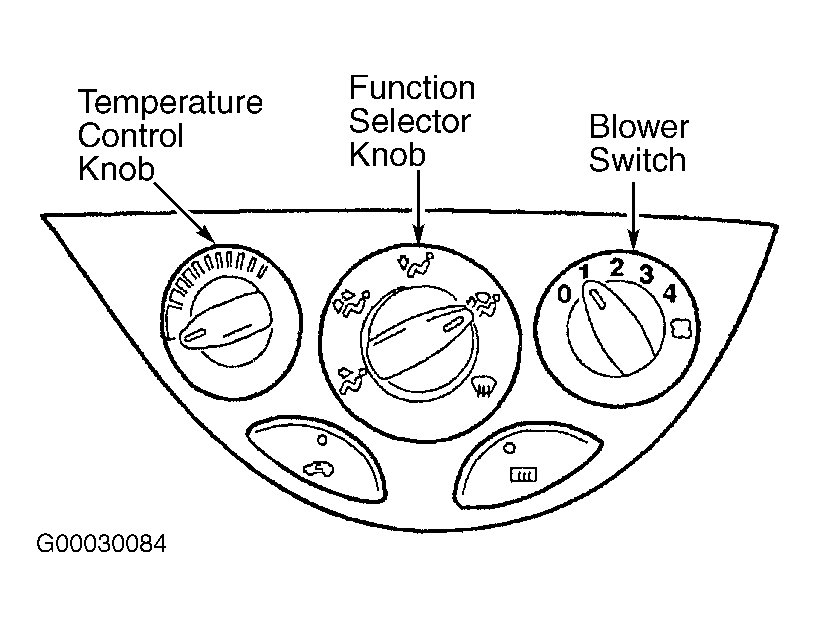 Function selector knob can be placed in panel, panel/floor, floor, floor/defrost or defrost position. See Figure. Function selector knob operates a cable connected to recirculation air actuator (next to blower motor). Which operate floor/defrost and panel doors.