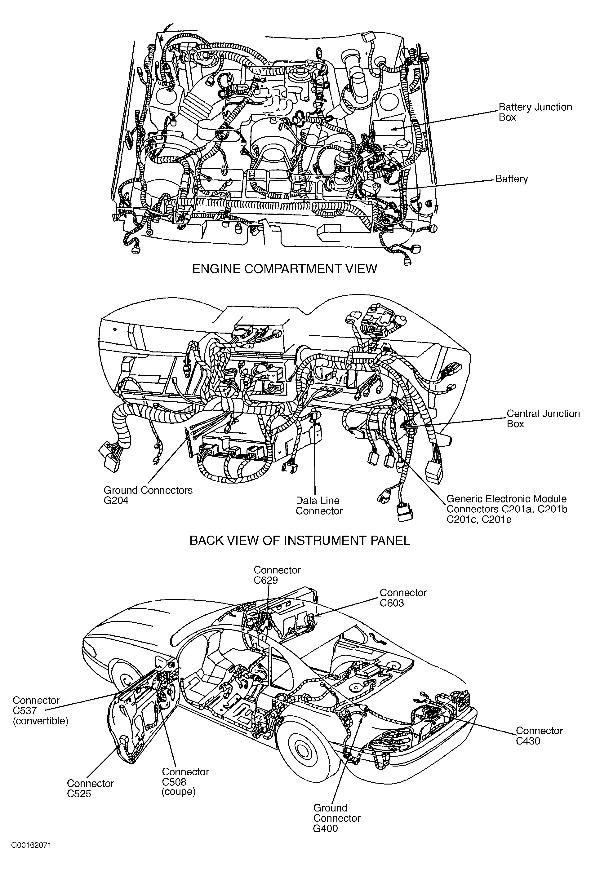 - Turn ignition switch to LOCK position. Measure resistance between ground and GEM harness connector C201b terminal No. 2 (Black/White wire). If resistance is 5 ohms or less, repair module communication concern. See MODULE COMMUNICATIONS NETWORK - MUSTANG article. If resistance is more than 5 ohms, repair open circuit in Black/White wire between GEM and ground point G204. Ground point G204 is located behind center of instrument panel. See Figure. For GROUND DISTRIBUTION circuit identification. See WIRING DIAGRAMS . After repair, clear DTCs, repeat self-test and check system for normal operation.