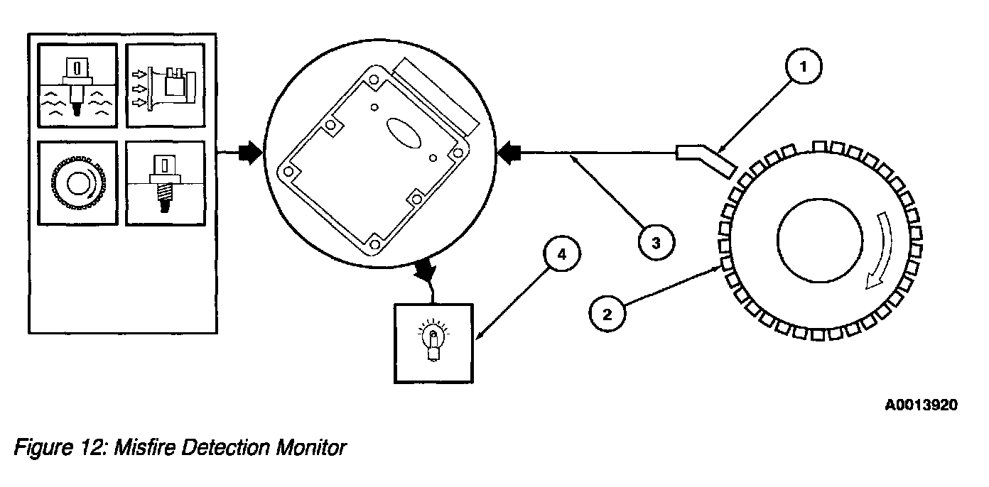 The Misfire Detection Monitor is an on-board strategy designed to monitor engine misfire and identify the specific cylinder in which the misfire has occurred. Misfire is defined as lack of combustion in a cylinder due to absence of spark, poor fuel metering, poor compression, or any other cause. The Misfire Detection Monitor will be enabled only when certain base engine conditions are first satisfied. Input from the Engine Coolant Temperature (ECT) or Cylinder Head Temperature (CHT), Mass Air Flow (MAF) and Crankshaft Position (CKP) sensors is required to enable the monitor. The Misfire Detection Monitor is also performed during on demand self-test.