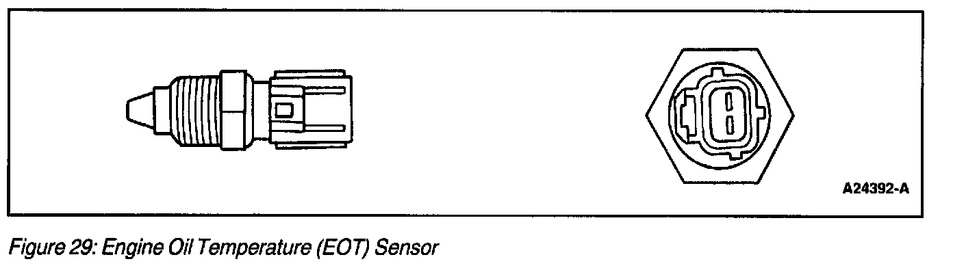 The Engine Oil Temperature (EOT) sensor (Figure 29) is a thermistor device in which resistance changes with temperature. The electrical resistance of a thermistor decreases as the temperature increases and increases as the temperature decreases. The varying resistance affects the voltage drop across the sensor terminals and provides electrical signals to the PCM corresponding to temperature.