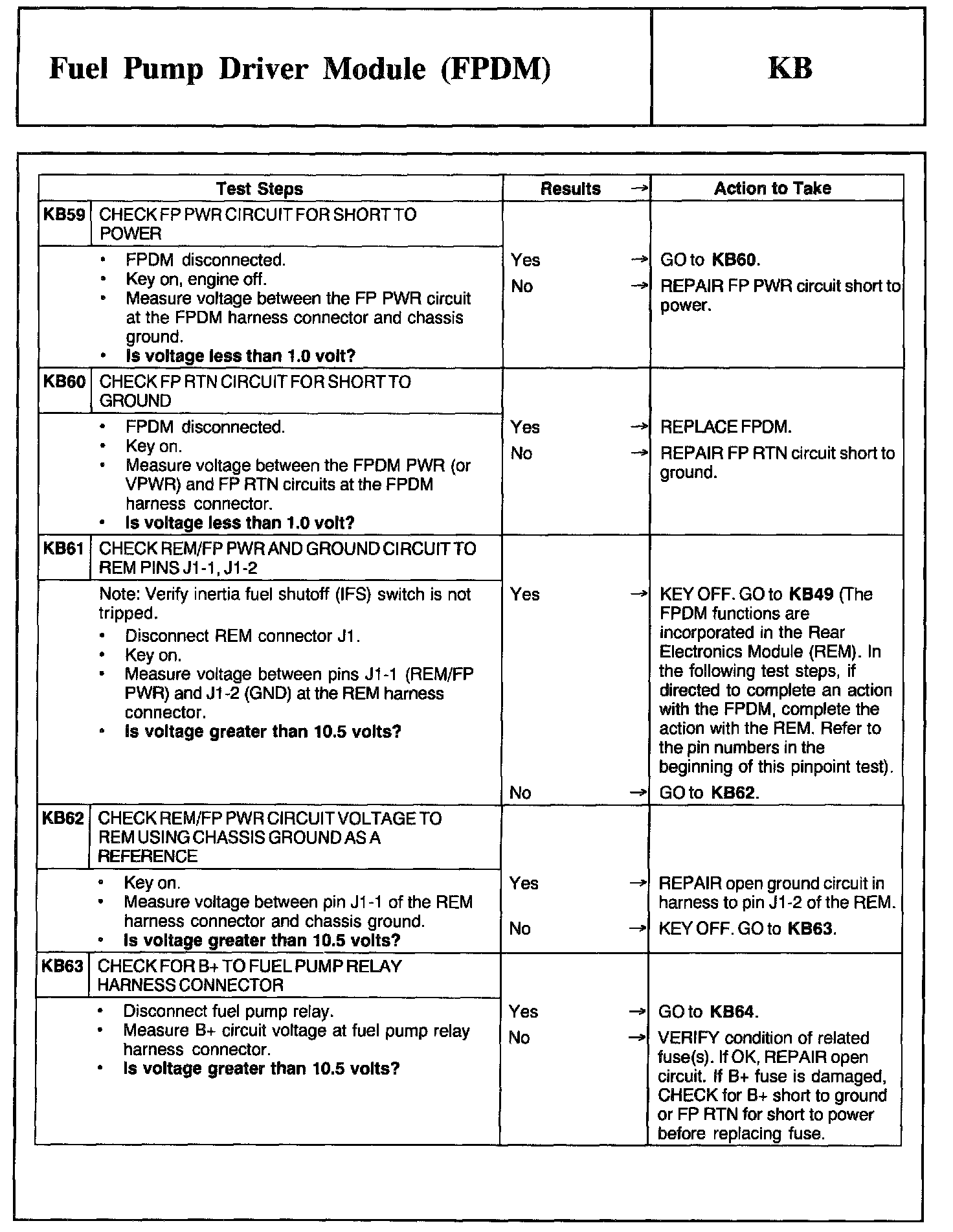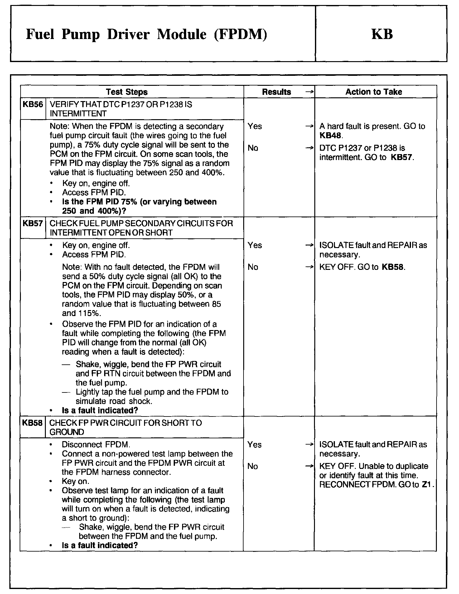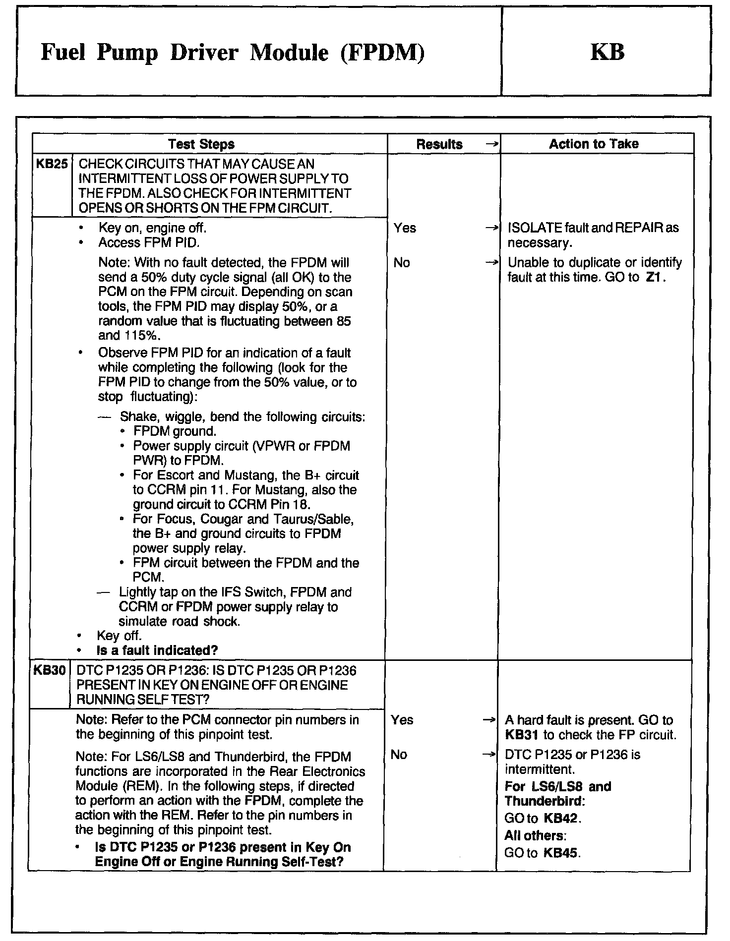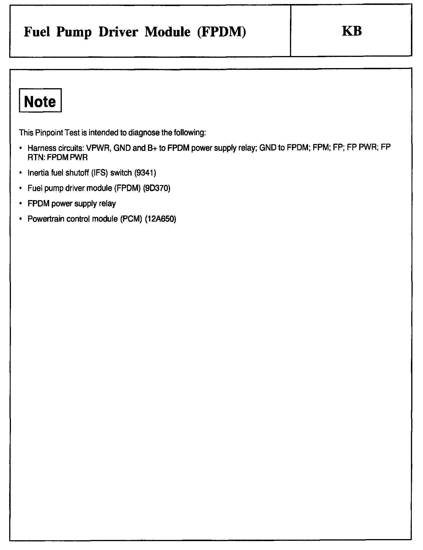 Home >> Ford >> 2002 >> Mustang V6-3.8L VIN 4 >> Repair and Diagnosis >> Powertrain Management >> Computers and Control Systems >> Testing and Inspection >> Pinpoint Tests >> Tests KB: Fuel Pump Driver Module (FPDM)